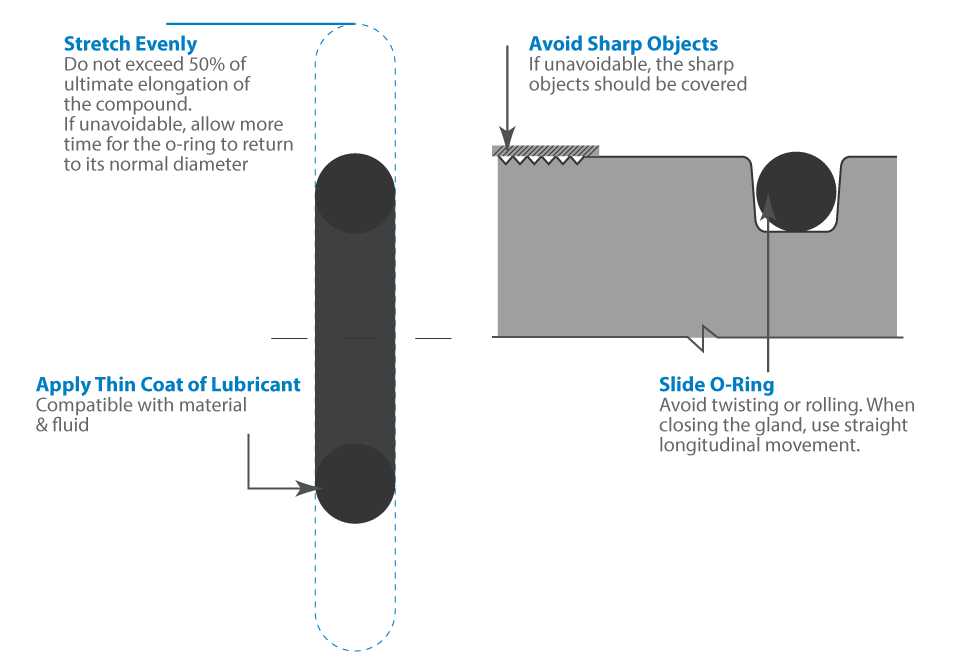 1. Stretch the O-ring Evenly - Rule of thumb is to not exceed 50% of the ultimate elongation of the o-ring compound. If it needs to exceed, allow more time for the o-ring to return to its normal diameter.